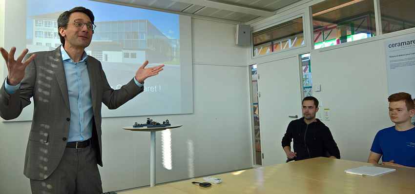 Image : M. Sébastien Schlup donne des explications sur les compétences recherchées par Ceramaret à une audience très attentive. A droite Mme la Conseillère d’Etat Monika Maire-Hefti, cheffe du département de l’éducation et de la famille.