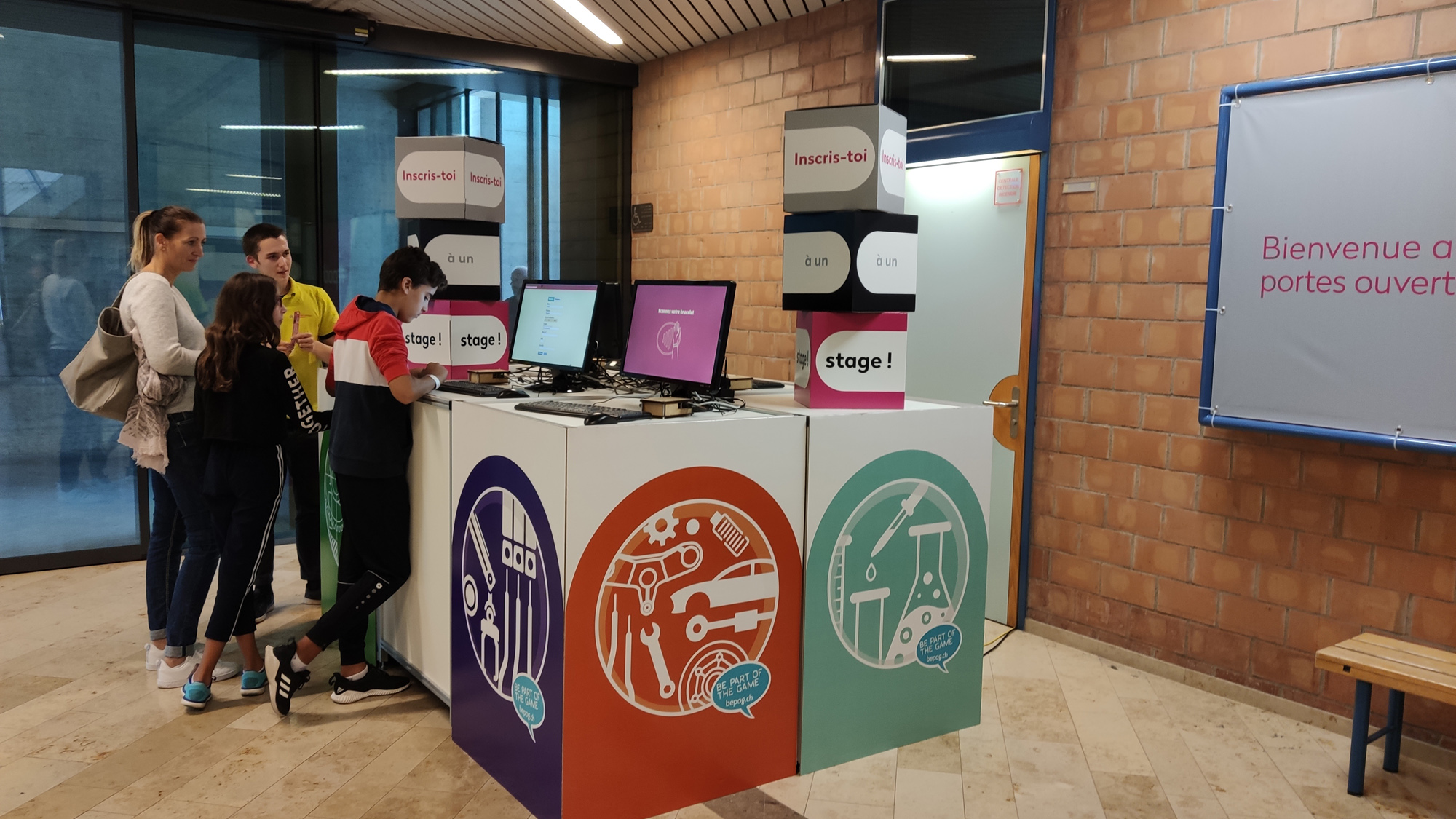 A l'entrée de la division technique, les visiteurs peuvent trouver les possibilités d'inscriptions pour les stages.. mais et surtout, le système de bracelets RFID qui ouvrent de nombreuses possibilités supplémentaires aux visiteurs (c'est l'Industrie 4.0 appliquée aux visiteurs). C'est à ne pas manquer!