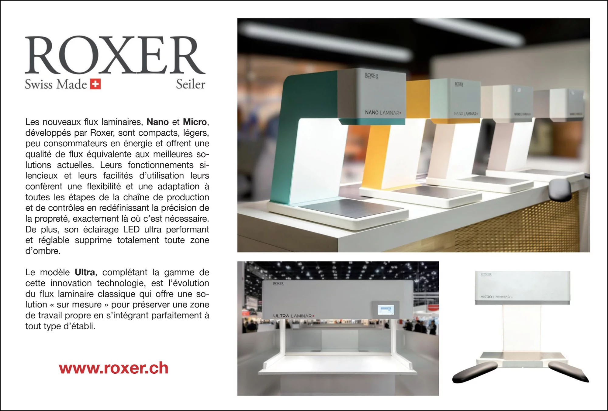 Les nouveaux Nano, Micro et Ultra Laminar de Roxer sont très efficaces, peu gourmands en énergie et très ergonomiques tout en étant plus légers et nettement moins encombrants que les solutions traditionnelles. En étant compacts et en concentrant précisément les flux laminaires là où ils sont nécessaires, les Micro Laminar et Nano Laminar augmentent notablement le spectre d'utilisation de ces derniers. Le CEO Christophe Giorgis explique : "Aujourd'hui nous pouvons amener les flux laminaires là où ils sont nécessaires. C'est un changement important dans notre domaine".