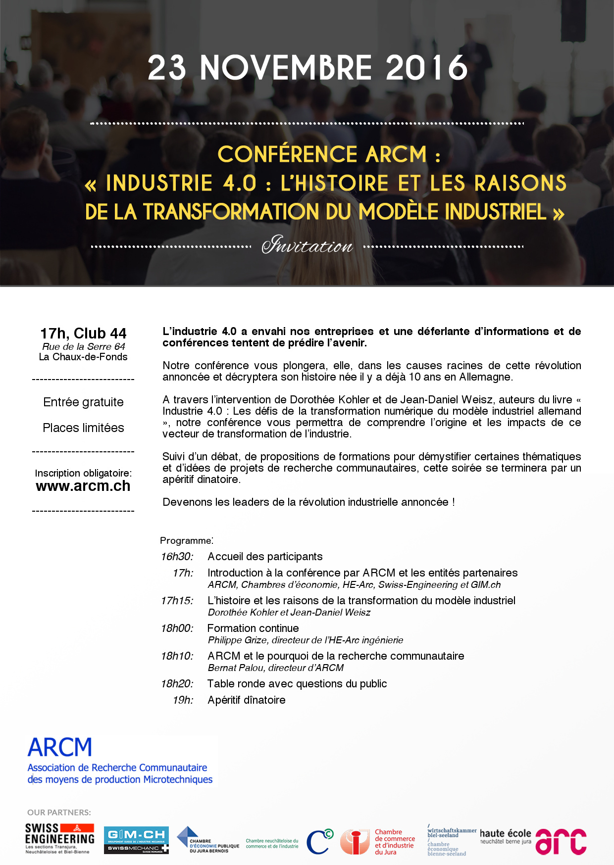 La conférence aura lieu au Club 44, à la Chaux-de-Fonds. L'inscription à la conférence est gratuite mais obligatoire sur le site web: www.arcm.ch
