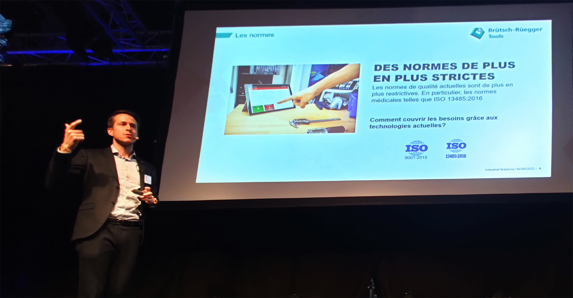 Raphaël Müller (Brütsch/Rüegger Tools) lors de son explication sur l'IoT appliquée simplement dans des processus de production dans le domaine médical (exemple).
