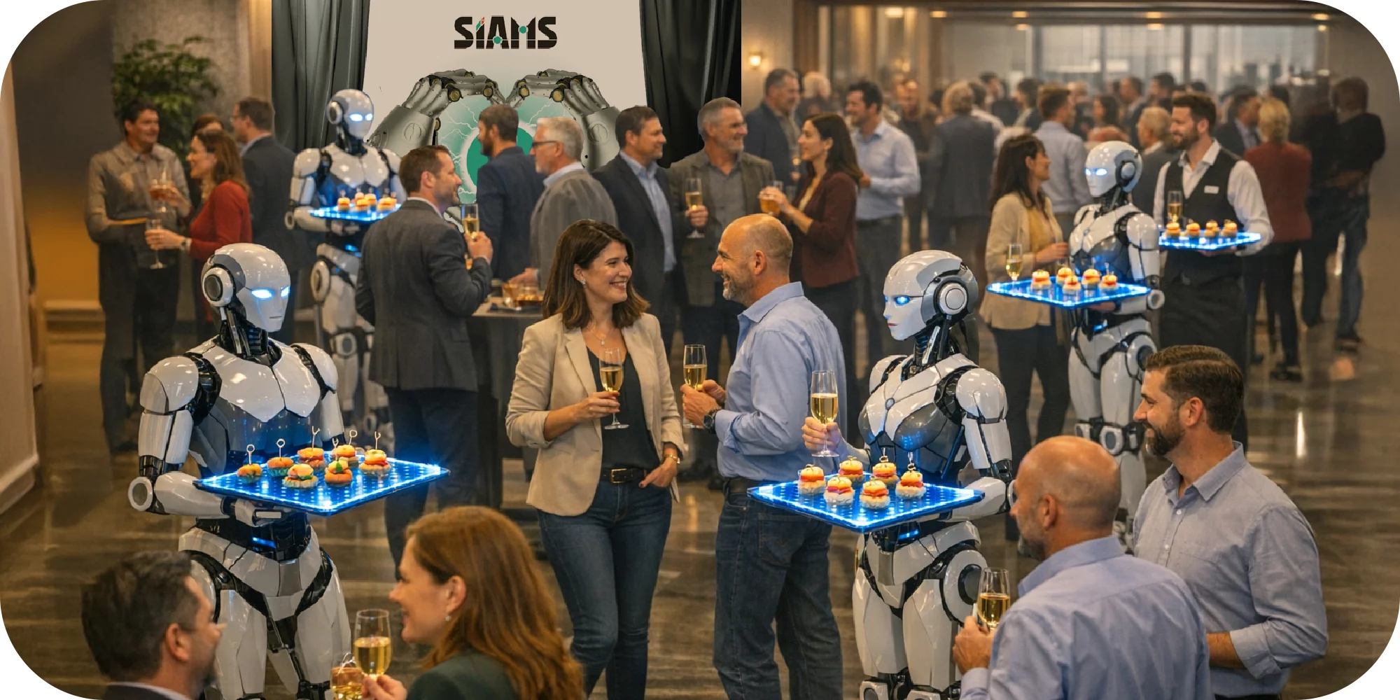 Fidèle à sa réputation de "défricheur technologique" au service de ses exposants, le SIAMS a cette année décidé de régler le problème des apéritifs dînatoires. Le directeur explique: "Nous avons déjà tous été confrontés à cette situation, vous avez un verre dans une main, des petits fours dans l'autre et vous vous retrouvez un peu coincé (par exemple pour donner une carte de visite, montrer un document ou scanner les coordonnées de votre interlocuteur avec votre téléphone)… c'est toujours un peu ennuyant et frustrant".