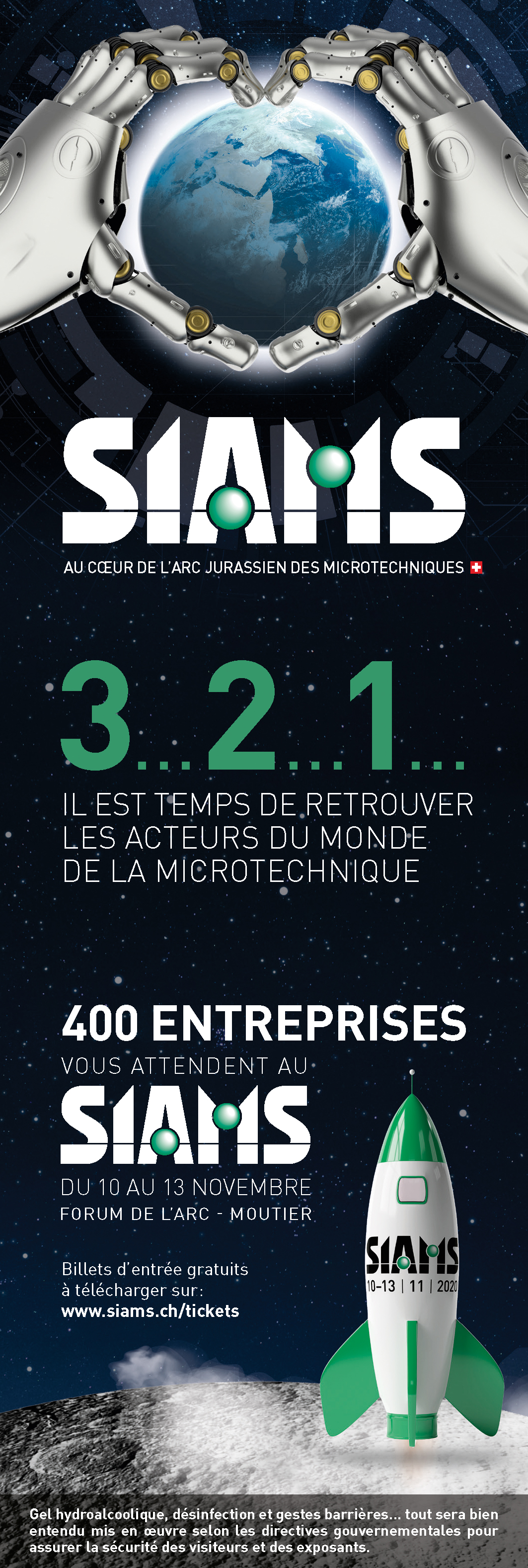 A ce jour, les organisateurs et les exposants espèrent que la détente va continuer et qu’en novembre, il sera possible de se réunir pour faire des affaires dans une ambiance sympathique. "Les entreprises ont plus que jamais besoin de présenter le fruit de leur travail et de faire connaître leurs produits et services" ajoute le directeur qui continue : "Nous suivrons bien entendu les directives de la confédération et mettrons en place les mesures sanitaires qui s’imposent. Plusieurs de nos exposants sont producteurs de solutions de protection (gel hydroalcoolique, distributeurs, visières) et nous verrons avec eux à organiser un SIAMS sans problème sanitaire. Si le monde repart en fin d’année, ça sera avec un super SIAMS en novembre!".