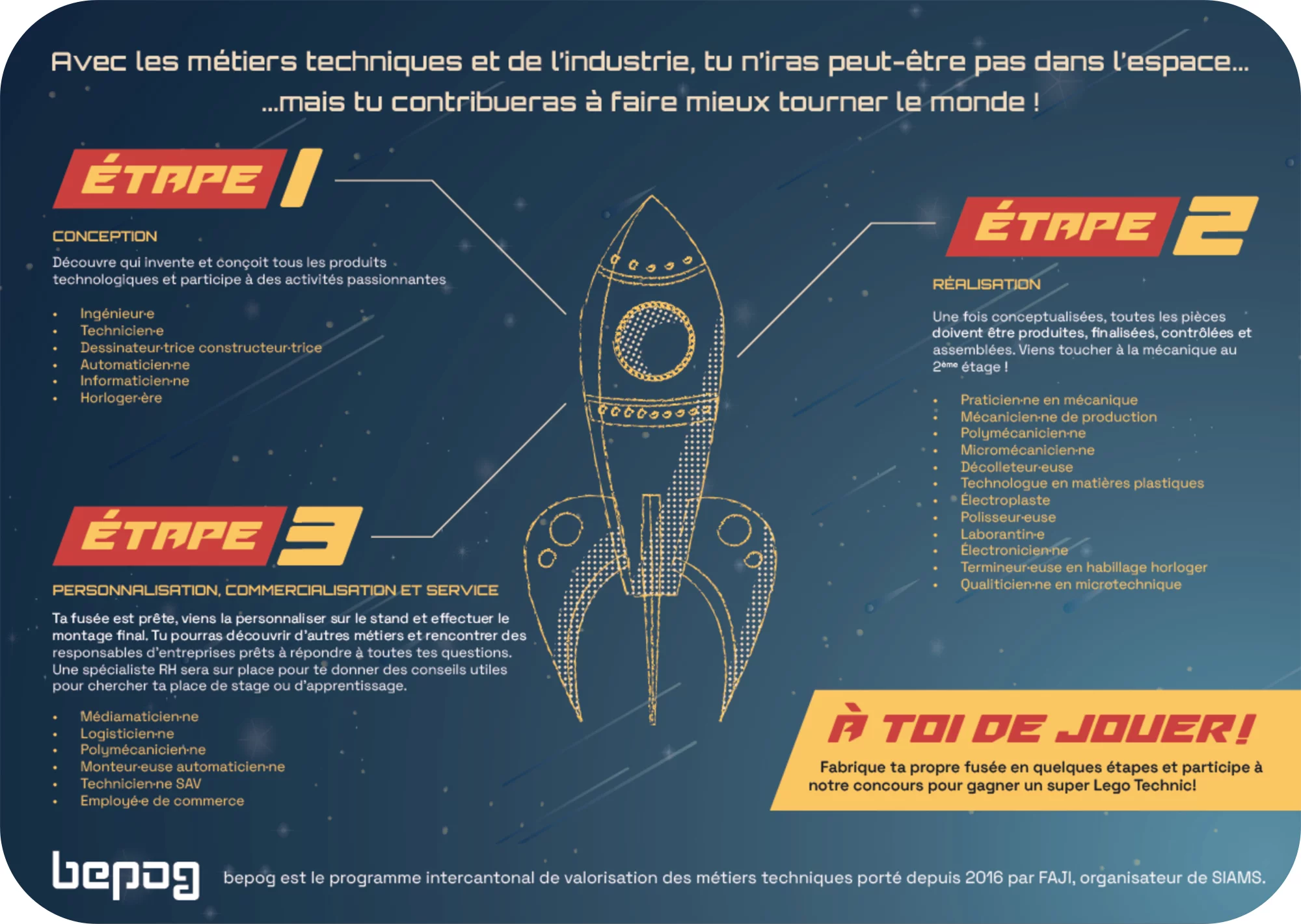 Avec le programme bepog, FAJI (organisatrice de SIAMS) est active depuis 10 ans dans la valorisation des métiers techniques, principalement par des actions destinées aux élèves des écoles secondaires des cantons de Berne (partie francophone), du Jura, de Neuchâtel et du nord vaudois.