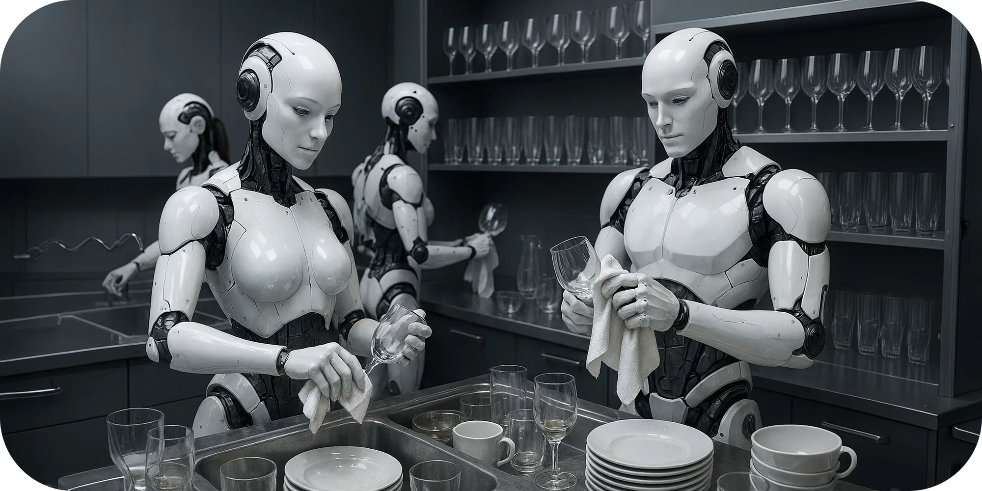 Location de vaisselle et possibilités de lavage. Image réalisée avec trucage, SIAMS fournit les machines à laver et l'évier mais pas les robots.
