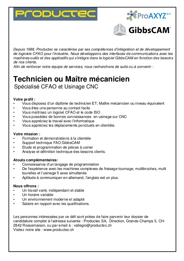 Afin de renforcer notre équipe de service nous recherchons de suite ou à convenir: Technicien ou Maître mécanicien spécialisé CFAO et Usinage CNC.