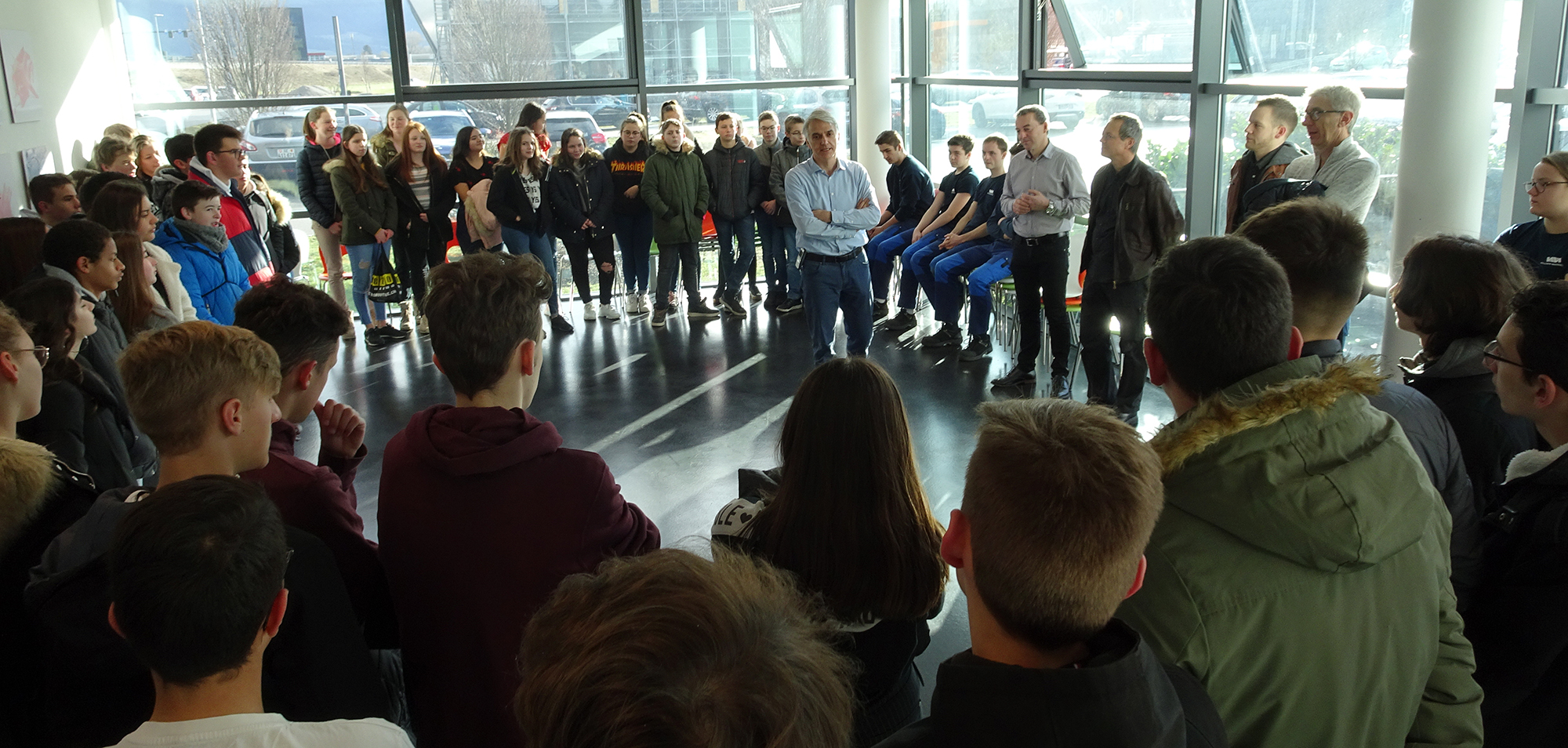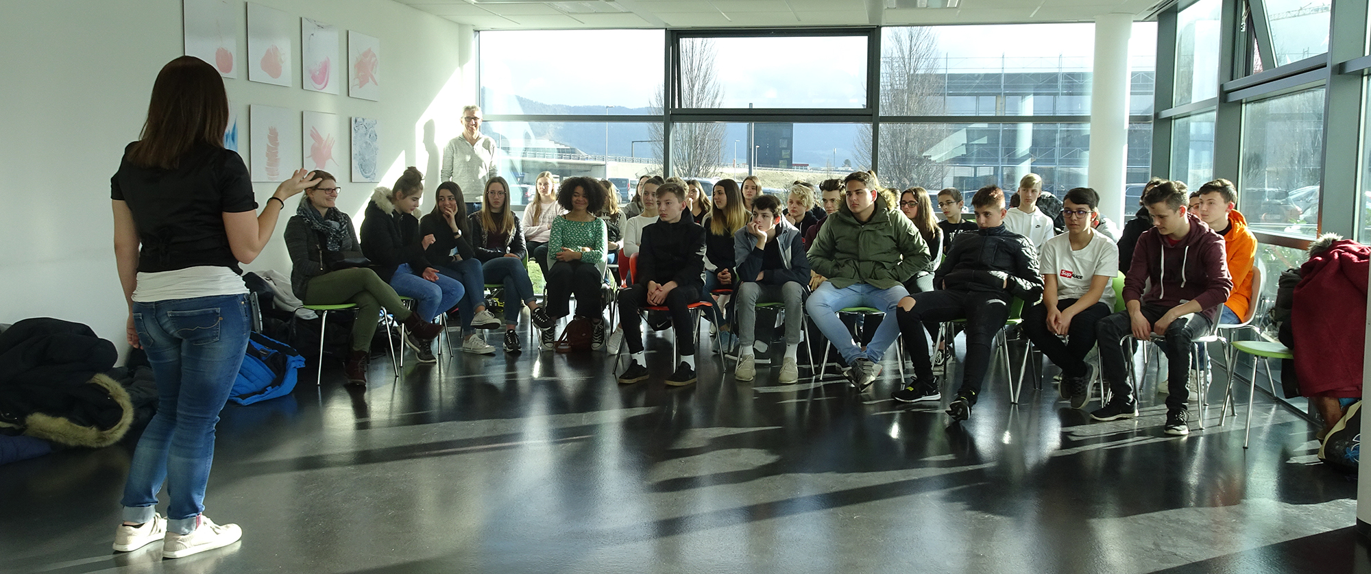 Les quatre classes de 10H se sont séparées et tandis que deux classes visitaient l’entreprise sous la conduite de Messieurs Olivier Haegeli, directeur général adjoint et Denis Jeannerat, directeur technologique, les autres classes ont pu découvrir les formations et les métiers offerts par l’entreprise, notamment grâce à M. Mickaël Urrutia, responsable de formation qui était accompagné de cinq apprentis et jeunes professionnels ainsi que Mlle Mégane Steulet, responsable des ressources humaines. Ensuite les jeunes qui avaient réalisé la visite ont échangé leurs places avec les autres en salle de réunion.