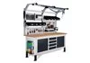 L'établi Work Steel Up à pieds réglables en hauteur permet d'effectuer des travaux d'entretien et d'autres opérations en ayant à portée de main tout le nécessaire grâce à la paroi perforée, à l'armoire à tiroirs et aux armoires à portes battantes.