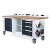 Work System Rol-Up ist der höhenverstellbare Werkbank, die dank der Räder mühelos verstellt werden kann. Der Energiekanal mit internationaler Sockelmodulen erlaubt eine Energiequelle für die täglich benutzten Werkzeugausstattung zur Verfügung zu haben.